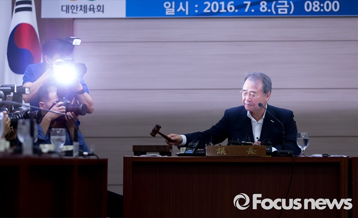 (서울=포커스뉴스) 8일 오전 서울 송파구 올림픽파크텔에서 열린 대한체육회 제4차 긴급 임시 이사회에서 강영중 대한체육회 회장이 의사봉을 두드리고 있다. 이번 임시 이사회에서는 박태환의 리우 올림픽 출전 여부가 긴급 안건으로 상정됐다.