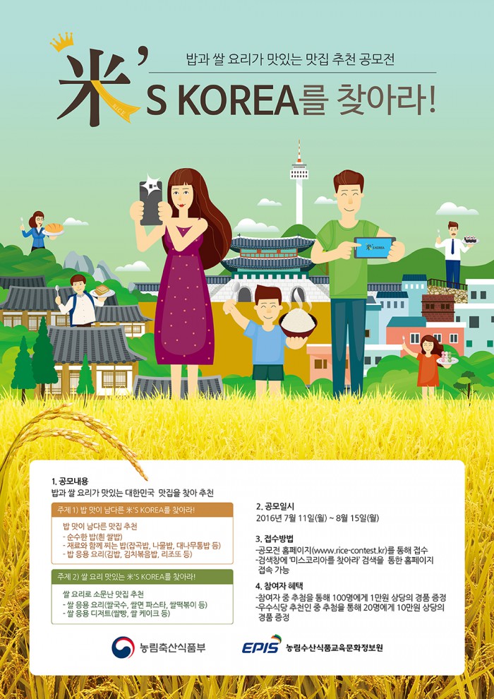 (서울=포커스뉴스) 농림축산식품부(장관 이동필, 이하 농식품부)가 7월11일부터 8월15일까지 쌀 소비 촉진 공모전 '米’s Korea를 찾아라!' 공모전을 실시한다.