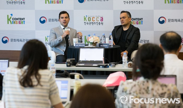 (서울=포커스뉴스) '캡틴 아메리카:시빌워' 조 루소(Joe Russo) 감독과 영화사 불릿의 토드 마커리스(Todd Makurath) 대표가 8일 오전 서울 마포구 누리꿈스퀘어에서 열린 제2차 콘텐츠 인사이트 기자간담회에 참석해 취재진 질문에 답변하고 있다.