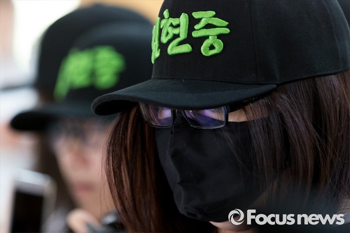 (서울=포커스뉴스) 8일 오후 서울중앙지방법원에서 전 여자친구와 민사소송 중인 가수 김현중의 홍콩, 일본, 중국 팬들이 김현중을 응원하는 손피켓을 들고 있다.