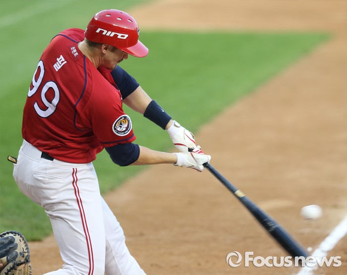 (서울=포커스뉴스) 8일 서울 잠실구장에서 열린 2016 프로야구 KIA-두산 경기 3회초 2사 1,3루에서 KIA 필이 좌월 3점 홈런을 치고 있다.