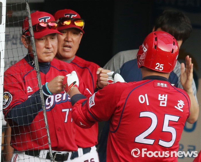 (서울=포커스뉴스) 8일 서울 잠실구장에서 열린 2016 프로야구 KIA-두산 경기 1회초 2사 1루에서 KIA 이범호가 좌월 2점 홈런을 치고 덕아웃에서 김기태 감독이 환영을 받고 있다.