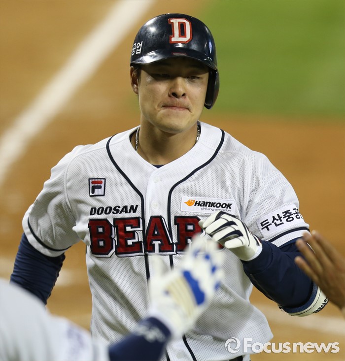 (서울=포커스뉴스) 8일 서울 잠실구장에서 열린 2016 프로야구 KIA-두산 경기 8회말 1사 2루에서 두산 민병헌이 우월 2점 홈런을 치고 홈인하고 있다.