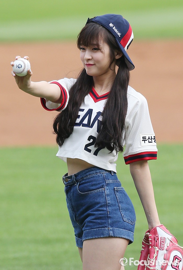 (서울=포커스뉴스) 10일 서울 잠실구장에서 열린 2016 프로야구 넥센-두산 경기에 앞서 걸그룹 '오마이걸'의 아린이 시구하며 볼오 타자를 겨냥하고 있다.