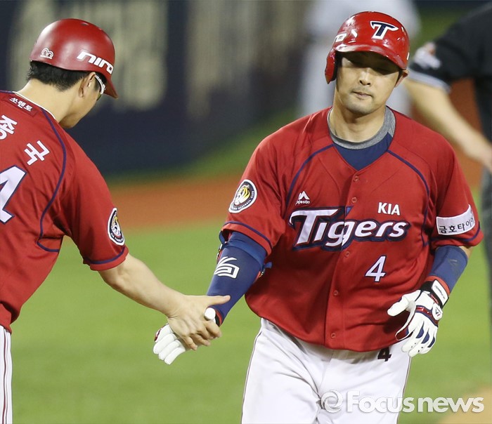 (서울=포커스뉴스) 10일 서울 잠실구장에서 열린 2016 프로야구 KIA-두산 경기 7회초 2사후 KIA 서동욱이 솔로 홈런을 치고 3루를 돌며 김종국 코치의 환영을 받고 있다.