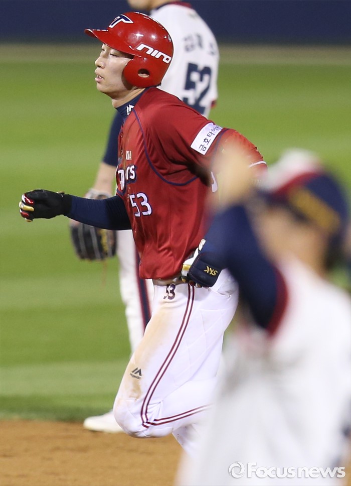 (서울=포커스뉴스) 10일 서울 잠실구장에서 열린 2016 프로야구 KIA-두산 경기 7회초 KIA 김호령이 좌월 솔로 홈런을 치고 그라운드를 돌고 있다.