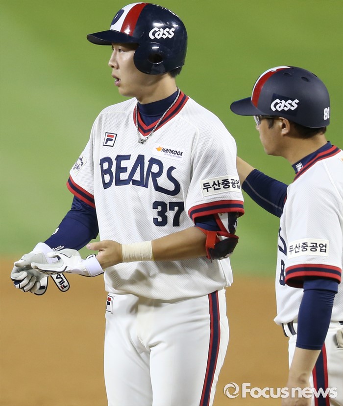(서울=포커스뉴스) 10일 서울 잠실구장에서 열린 2016 프로야구 KIA-두산 경기 7회말 2사 3루에서 두산 박건우가 좌전 적시타를 치고 주루코치의 사인을 바라보고 있다.