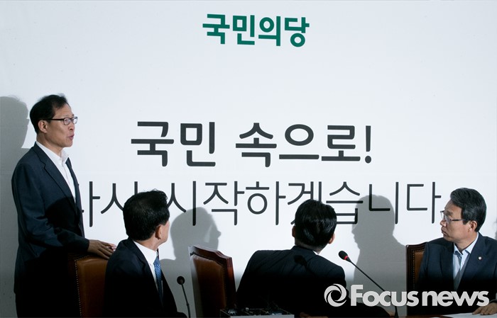 (서울=포커스뉴스) 11일 오전 서울 여의도 국회에서 열린 국민의당 비상대책위원회의에 참석한 박지원(오른쪽 두번째) 비대위원장 등 의원들이 문병호(왼쪽 첫번째) 전략홍보본부장으로부터 백보드 교체 관련 설명을 듣고 있다.