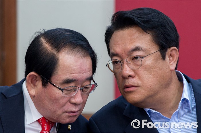 (서울=포커스뉴스) 정진석(오른쪽) 새누리당 원내대표와 박명재 사무총장이 11일 오전 서울 여의도 새누리당사에서 열린 혁신비상대책위원회의에 참석해 대화 하고 있다.