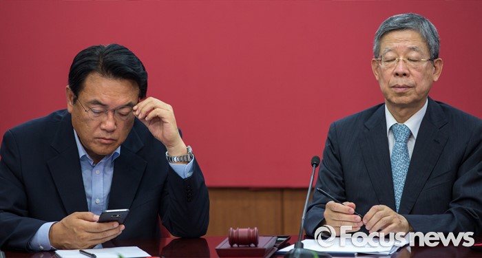 (서울=포커스뉴스) 김희옥(오른쪽) 새누리당 혁신비상대책위원장과 정진석 새누리당 원내대표가 11일 오전 서울 여의도 새누리당사에서 열린 혁신비상대책위원회의에 참석 하고 있다.