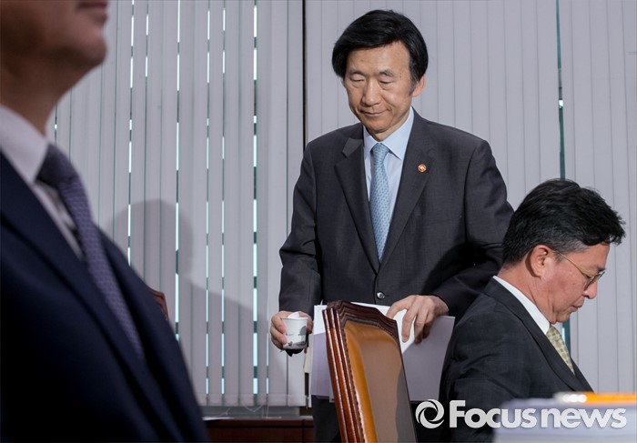 (서울=포커스뉴스) 11일 오전 서울 여의도 국회에서 열린 외교통일위원회 전체회의에 참석한 윤병세 외교부 장관이 제안설명을 마친 뒤 자리로 향하고 있다. 오른쪽은 홍용표 통일부 장관.