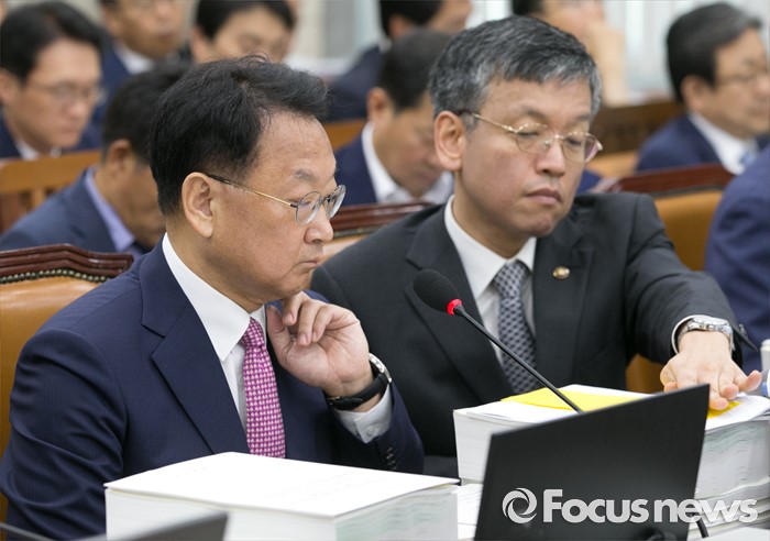 (서울=포커스뉴스) 11일 오전 서울 여의도 국회에서 열린 기획재정위원회 전체회의에 참석한 유일호(왼쪽) 경제부총리 겸 기획재정부 장관이 최상목 1차관으로부터 메모를 전달받고 있다.