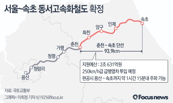 (서울=포커스뉴스) 11일 국토교통부는 동서고속화철도건설 사업을 확정했다. 춘천~속초 철도사업은 춘천에서부터 화천, 양구, 인제, 속초까지 93.9㎞ 단선전철을 건설하는 사업으로 2조631억원의 재원이 투입될 예정이다.