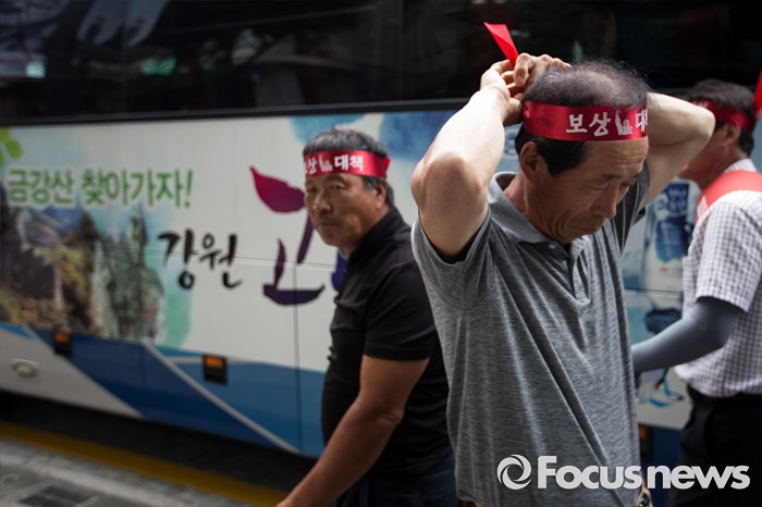 (서울=포커스뉴스) 금강산관광 중단 8년째를 맞아 금강산관광 중단 피해대응 고성군 추진위원회 회원들이 11일 오후 서울 종로구 서울정부청사앞에서 지원대책 마련 촉구 집회를 갖기 위해 이동하고 있다.