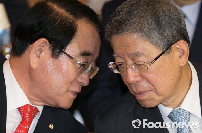 (서울=포커스뉴스) 11일 오후 서울 여의도 중소기업중앙회관에서 열린 새누리당 전국원외위원장협의회 전체회의에 참석한 김희옥(오른쪽) 혁신비대위원장과 박명재 사무총장이 대화하고 있다.