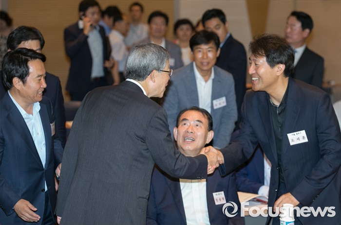 (서울=포커스뉴스) 11일 오후 서울 여의도 중소기업중앙회관에서 열린 새누리당 전국원외위원장협의회 전체회의에 참석한 김희옥(가운데) 혁신비대위원장과 오세훈(오른쪽) 종로구 위원장이 악수하고 있다.