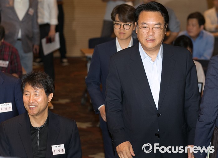 (서울=포커스뉴스) 11일 오후 서울 여의도 중소기업중앙회관에서 열린 새누리당 전국원외위원장협의회 전체회의에 정진석 원내대표가 참석하고 있다. 왼쪽 앉은 사람은 오세훈 종로구 위원장.