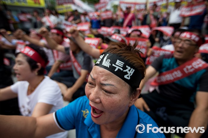(서울=포커스뉴스) 금강산관광 중단 8년째를 맞아 금강산관광 중단 피해대응 고성군 추진위원회 회원들이 11일 오후 서울 종로구 서울정부청사앞에서 지원대책 마련을 촉구하며 구호를 외치고 있다.