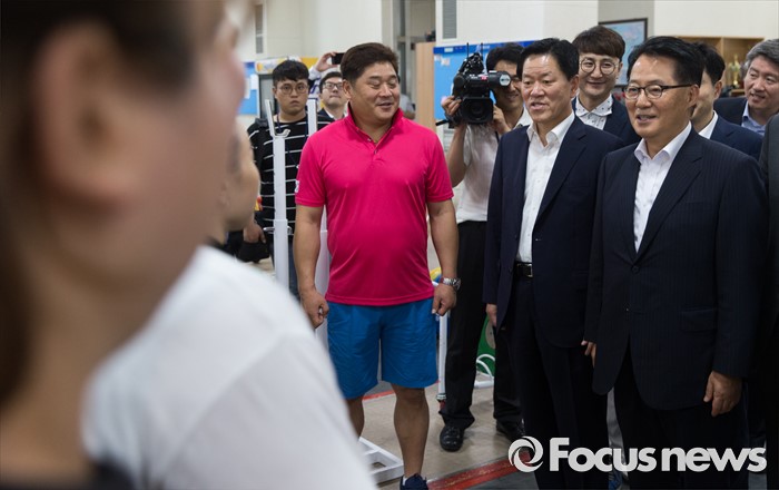 (서울=포커스뉴스) 박지원(오른쪽) 국민의당 비상대책위원장을 비롯한 주요 당직자들이 11일 오후 서울 노원구 태릉선수촌에 방문해 역도 국가대표 선수들을 격려하고 있다.