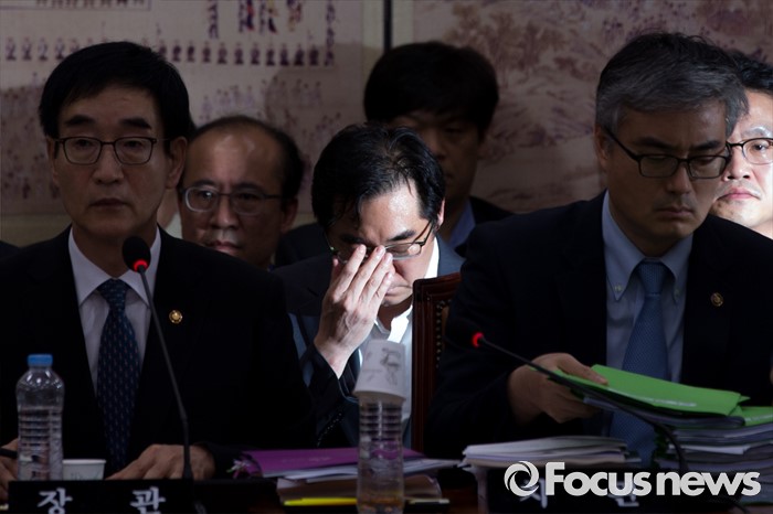 (서울=포커스뉴스) 민중을 개, 돼지로 표현한 발언으로 비판을 받고 있는 나향욱(가운데) 교육부 정책기획관이 11일 오후 서울 여의도 국회에서 열린 교육문화체육관광위원회 전체회의에 참석해 얼굴을 만지고 있다.