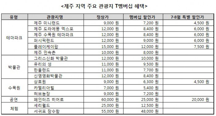 (서울=포커스뉴스) SK텔레콤이 여름 휴가철을 맞아 제주도 내 인기 관광지 16곳과 새롭게 제휴하고, 13일부터 T멤버십 고객에게 할인 혜택을 제공한다.