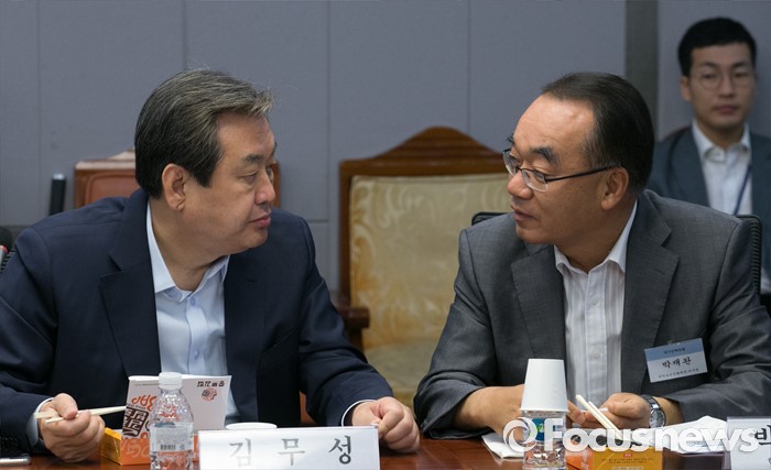 (서울=포커스뉴스) 12일 오전 서울 여의도 국회 의원회관에서 국가전략포럼 주최로 열린 국민이 바라는 개헌, 어떻게 할 것인가? 세미나에 참석한 김무성(왼쪽) 새누리당 전 대표와 박재완 한반도선진화재단 이사장이 대화하고 있다.