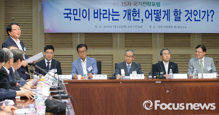 (서울=포커스뉴스) 12일 오전 서울 여의도 국회 의원회관에서 국가전략포럼 주최로 열린 국민이 바라는 개헌, 어떻게 할 것인가? 세미나에 참석한 이갑산(왼쪽 첫번째) 범시민사회단체연합 상임대표가 내빈소개를 하고 있다.