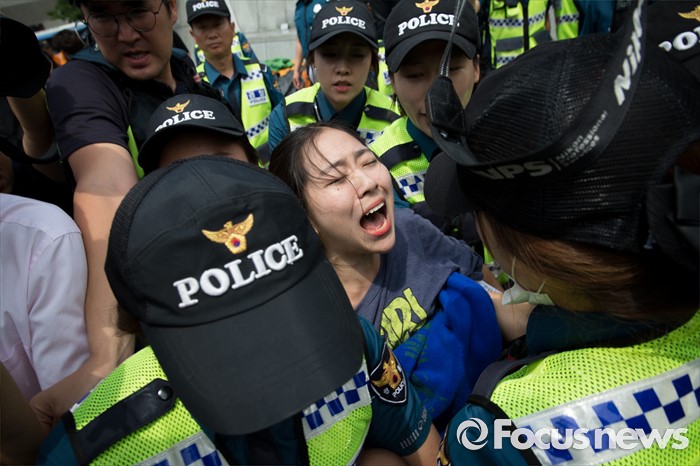 (서울=포커스뉴스) 12일 오전 서울 종로구 광화문광장 세종대왕 동상에서 최저임금 1만원 인상을 요구하며 시위를 하던 알바연대알바노조가경찰에게 연행되고 있다.