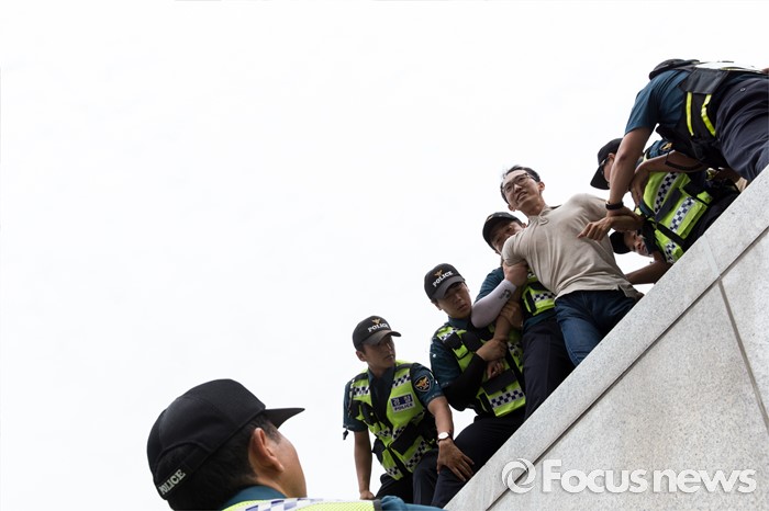 (서울=포커스뉴스) 12일 오전 서울 종로구 광화문광장 세종대왕 동상에서 알바연대알바노조가 최저임금 1만원 인상을 요구하며 기습시위를 벌이고 있다.