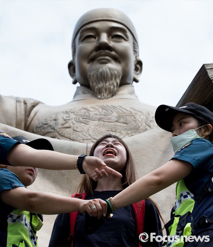 (서울=포커스뉴스) 12일 오전 서울 종로구 광화문광장 세종대왕 동상에서 알바연대알바노조가 최저임금 1만원 인상을 요구하며 기습시위를 벌이고 있다.