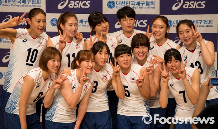 (진천=포커스뉴스) 12일 오전 충북 진천 선수촌 대강당에서 열린 '대한민국 여자배구 국가대표선수단 기자회견'에 참석한 선수들이 포즈를 취하고 있다. 이날 기자회견을 가진 여자배구 선수단은 리우올림픽을 대비해 23일 네덜란드로 전지훈련을 떠날 계획이다.