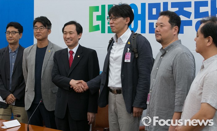 (서울=포커스뉴스) 우상호(왼쪽 세번째) 더불어민주당 원내대표가 12일 오전 서울 여의도 국회에서 열린 MB정권 이후 해직언론인과의 면담에 참석해 정영하(오른쪽 세번째) 전 MBC 노조위원장 등과 인사하고 있다.