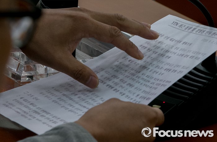 (서울=포커스뉴스) 노종면 YTN 해직기자가 12일 오전 서울 여의도 국회에서 열린 우상호 더불어민주당 원내대표와 MB정권 이후 해직언론인의 면담에 참석해 과거 보도된 사찰 관련 자료를 들고 발언하고 있다.