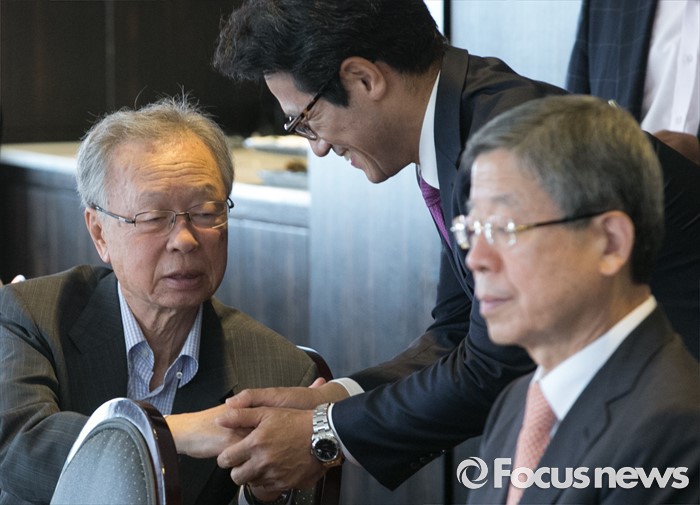 (서울=포커스뉴스) 전당대회 출마를 선언한 정병국 새누리당 의원이 12일 오후 서울 여의도 한 중식당에서 열린 김희옥 혁신비대위원장과 상임고문단의 오찬에 참석해 박희태 상임고문과 인사하고 있다.