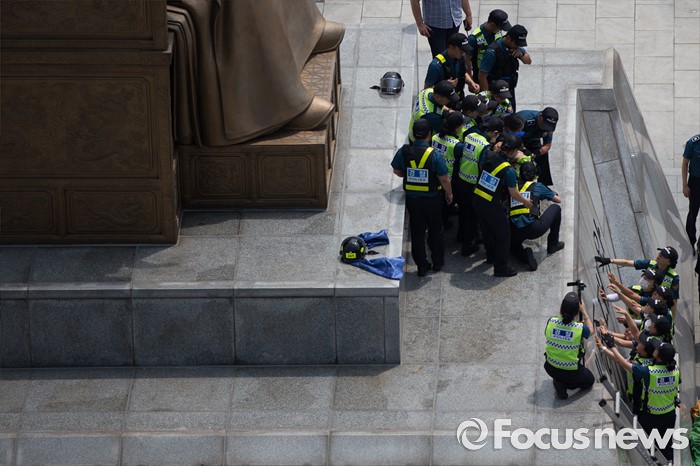 (서울=포커스뉴스) 12일 오전 서울 종로구 광화문광장 세종대왕 동상에서 알바연대알바노조가 최저임금 1만원 인상을 요구하며 기습시위를 벌이던 중 경찰들에게 제지당하고 있다.