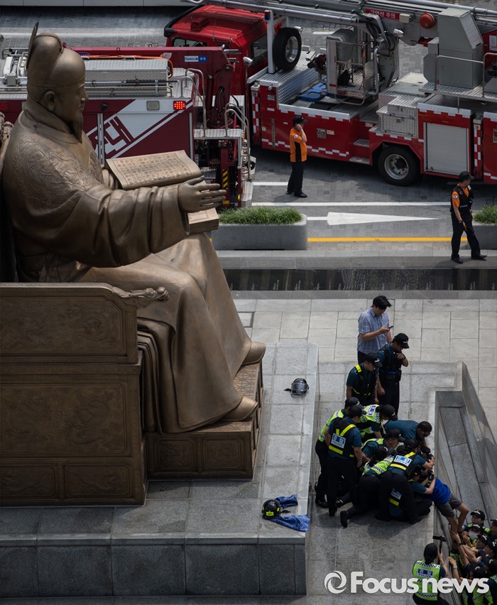 (서울=포커스뉴스) 12일 오전 서울 종로구 광화문광장 세종대왕 동상에서 알바연대알바노조가 최저임금 1만원 인상을 요구하며 기습시위를 벌이던 중 경찰들에게 제지당하고 있다.