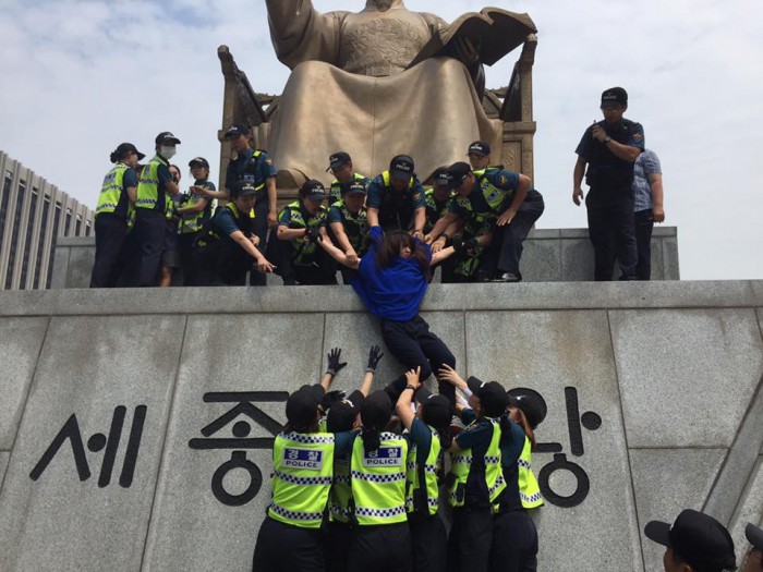 세종대왕 동상에서 기습시위를 벌인 이들은 사다리와 소방차를 동원한 경찰에 결국 연행됐다.