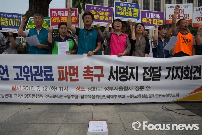 (서울=포커스뉴스) 12일 오전 서울 종로구 정부서울청사 앞에서 교육운동연대원들이 교육부 망언 고위관료 파면을 촉구하며 기자회견을 갖고 있다.