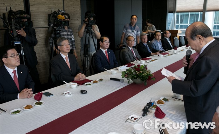 (서울=포커스뉴스) 김수한 새누리당 상임고문이 12일 오후 서울 여의도 한 중식당에서 열린 김희옥 혁신비대위원장과의 상임고문단 오찬에 참석해 인사말을 하고 있다.
