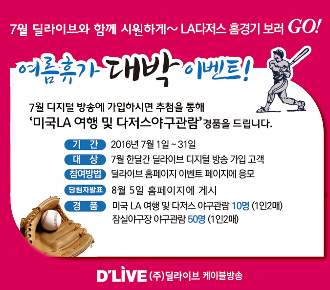 12일 딜라이브에 따르면 7월 한 달 동안 딜라이브 디지털방송에 신규 가입하는 고객을 대상으로 10명(1인 2매)을 추첨해 미국 메이저리그 LA다저스 야구관람 및 5박7일 여행의 기회를 제공한다. 50명(1인 2매)을 추첨해 KBO리그 잠실야구장 야구관람권도 선물한다.