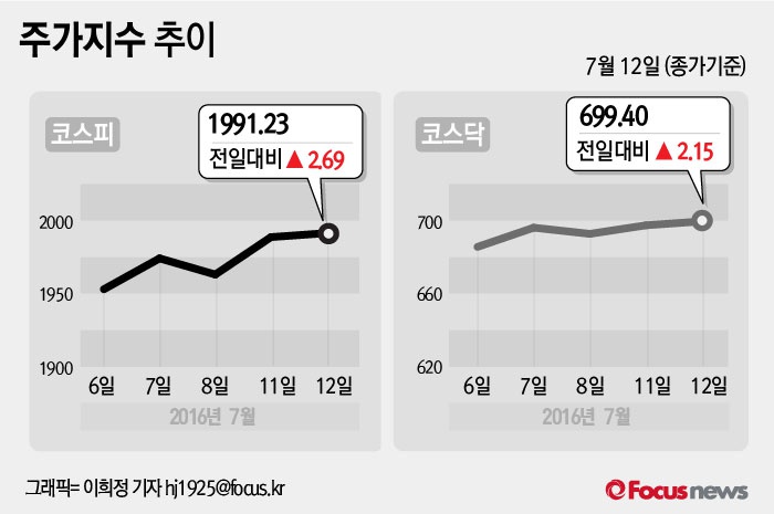 (서울=포커스뉴스) 12일 코스피지수는 전날보다 0.14%(2.69포인트) 오른 1991.23에 장을 마쳤다. 코스닥지수는 전일 대비 0.31%(2.15포인트) 오른 699.40에 마감했다.