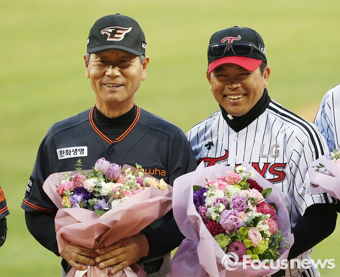 하지만 지난 2일 두산전에서는 1과 3분의 2이닝 5피안타(1피홈런) 1실점으로 조기강판됐다.(서울=포커스뉴스) 1일 서울 잠실구장에서 열린 2016프로야구 개막전 한화-LG 경기에 앞서 가진 개막식에서 김성근 한화 감독(왼쪽)과 양상문 LG 감독이 활짝 웃으며 기념사진을 찍고 있다. 2016.04.01 우정식 기자
