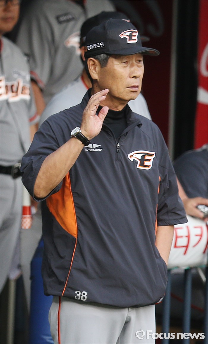 (서울=포커스뉴스) 12일 서울 잠실구장에서 열린 2016 프로야구 한화-LG 경기에서 한화 김성근 감독이 1회말 투수 송신영의 부상을 심각하게 바라보고 있다.