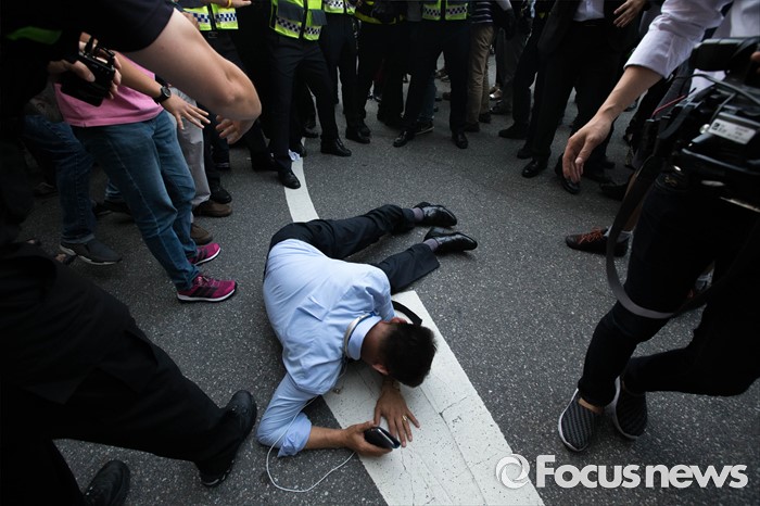 (서울=포컷뉴스) 12일 오후 서울 중구 밀레니엄서울힐튼호텔 앞에서 '일본 자위대 62주년 창설 기념식'을 규탄하는 시민단체들의 시위가 열리고 있는 가운데 한 시민이 격렬한 몸싸움 도중 쓰러져 있다.