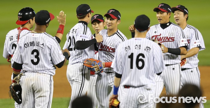 △ 하이파이브하며 기뻐하는 LG 선수들