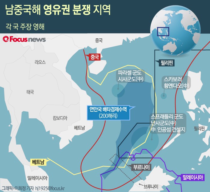 앞서 네덜란드 헤이그 소재의 PCA는 11일 '중국이 남중국해 해역에 대해 역사적인 권리를 주장하는 것에는 어떠한 법적인 근거도 없다'며 영유권 분쟁에 대해 필리핀 승소 판결을 내렸다.(워싱턴/미국=게티/포커스뉴스) 미국 백악관 전경. 2016.06.14 ⓒ게티이미지/이매진스 (서울=포커스뉴스) 남중국해 부근은 중국과 베트남, 필리핀, 말레이시아 등이 서로 영유권을 주장하고 있는 분쟁지역이다. 2016.01.04 이희정 기자