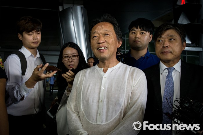 (인천=포커스뉴스) 명예훼손과 항공료 횡령 등 의혹으로 고소·고발된 정명훈(가운데) 전 서울시향 감독이 검찰 조사를 앞두고 13일 오전 인천 중구 인천공항을 통해 입국해 취재진의 질문에 답하고 있다.