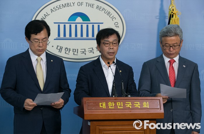 (서울=포커스뉴스) 13일 오전 서울 여의도 국회 정론관에서 이완영(경북 고령·성주·칠곡, 가운데) 새누리당 의원과 이만희(왼쪽), 이철우 의원이 사드 대구 및 경북지역 사드배치와 관련 항의 기자회견을 하고 있다.