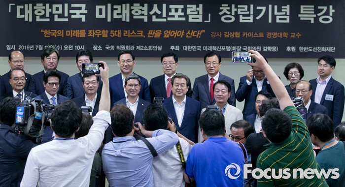(서울=포커스뉴스) 13일 오전 서울 여의도 국회 의원회관에서 열린 대한민국 미래혁신포럼 창립기념 특강에 참석한 김무성 새누리당 전 대표, 김학용 의원 등이 기념촬영을 하고 있다.