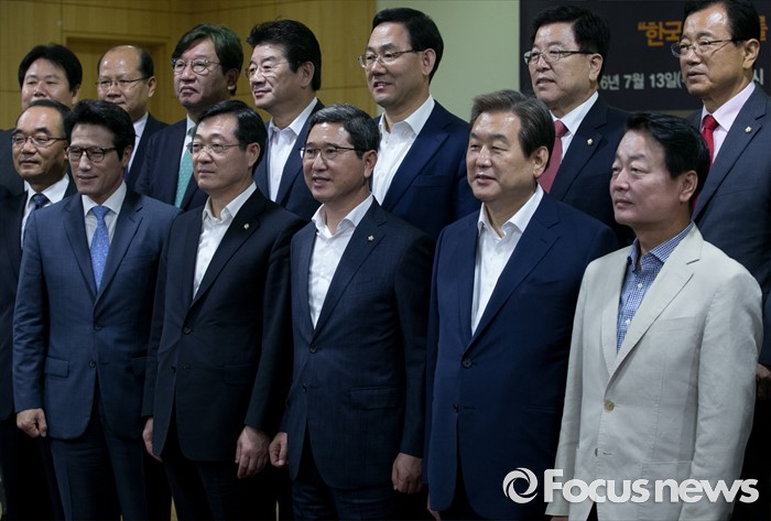 (서울=포커스뉴스) 13일 오전 서울 여의도 국회 의원회관에서 열린 대한민국 미래혁신포럼 창립기념 특강에 참석한 김무성 새누리당 전 대표, 김학용 의원 등이 기념촬영을 하고 있다.
